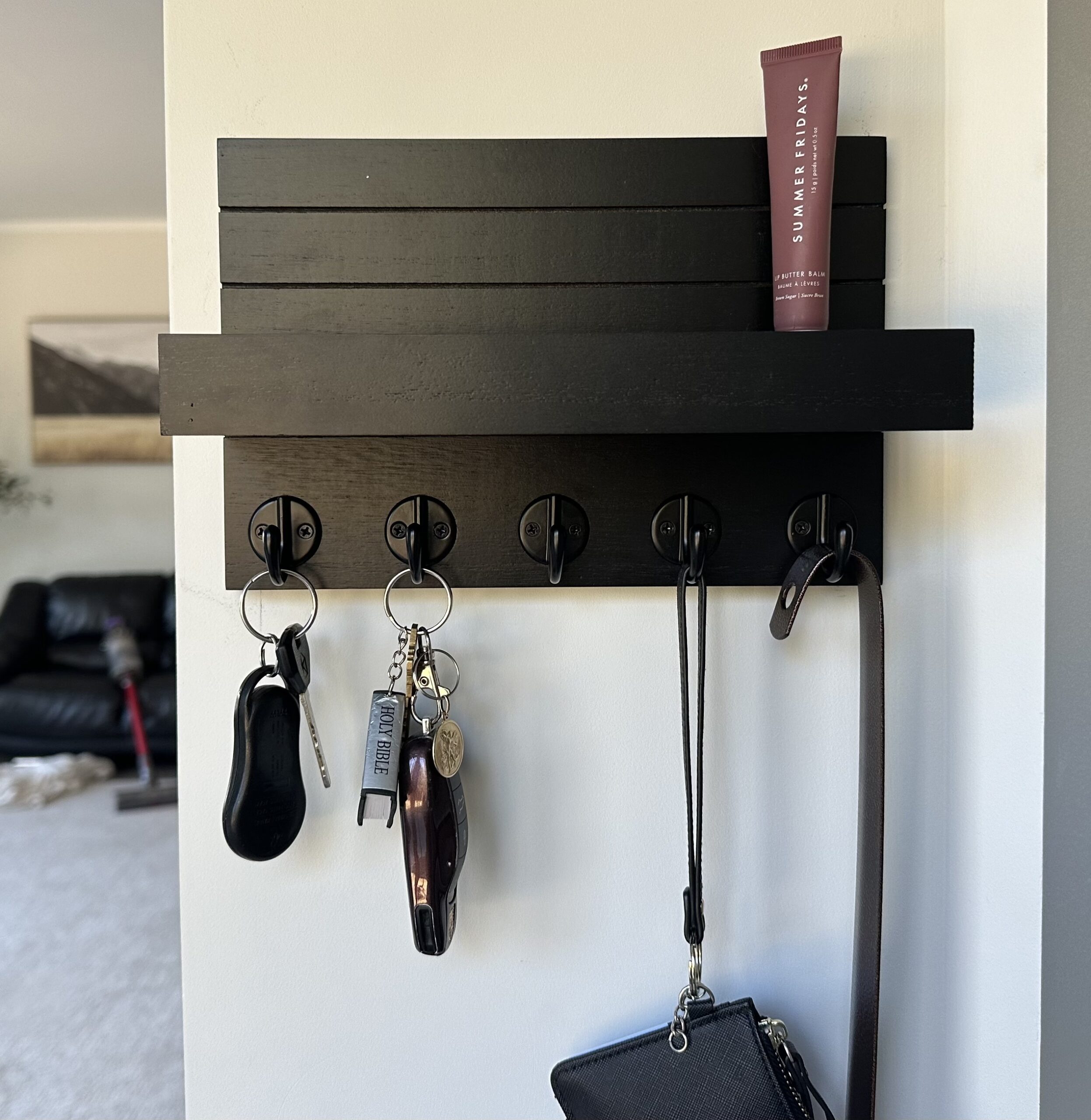 Organize your entryway in style with this wall-mounted key holder with shelf. Designed to keep your keys, wallets, and daily essentials in one place, it combines modern functionality with natural wooden elegance—perfect for a clean and clutter-free home.